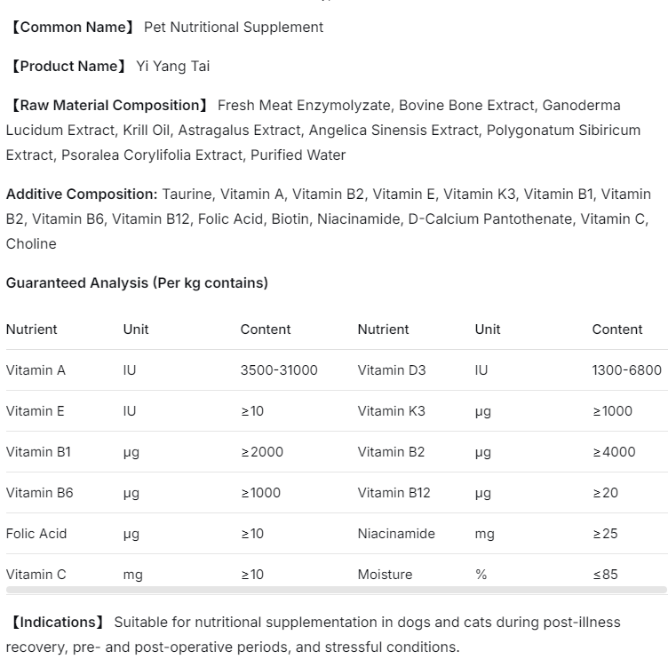 Henan Yipai Biotechnology presenta Yiyang Peptide , un tónico avanzado para mascotas debilitadas formulado específicamente para apoyar la recuperación y la vitalidad en animales debilitados. Este poderoso suplemento tónico energético para mascotas combina la sabiduría de la medicina tradicional china con la biotecnología moderna para brindar apoyo nutricional integral a las mascotas durante los períodos de convalecencia y estrés.